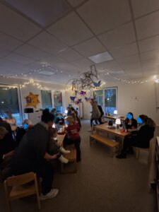 Zum Abschluss versammelten sich alle Eltern und Kinder in der Turnhalle. Höhepunkt war in diesem Jahr der einstudierte Tanz einiger Kinder zu dem Lied: „Es schneit!“. Alle zusammen sangen noch den Kitaklassiker : „In der Weihnachtbäckerei!“, und weil es so schön war, wurde noch „Wir tragen ein Licht“ zusammen gesungen.